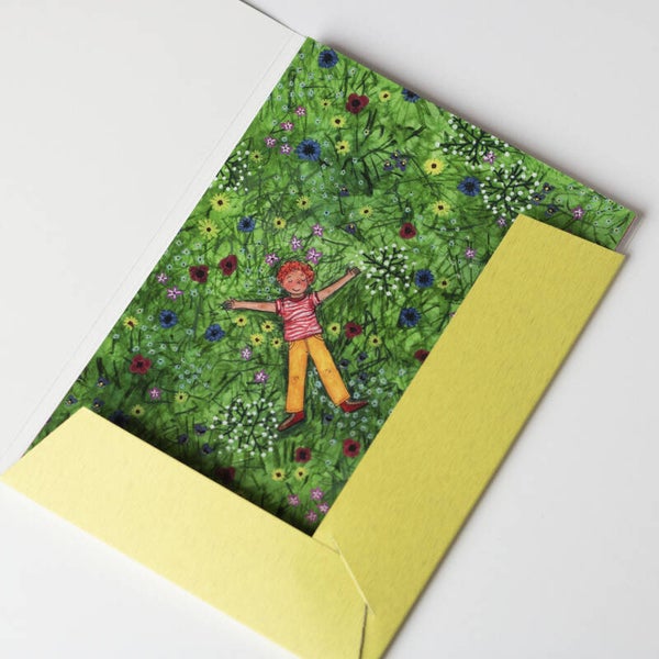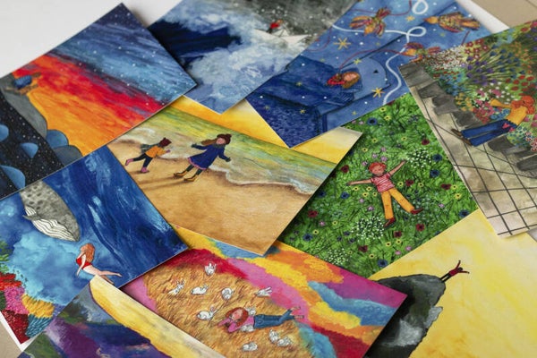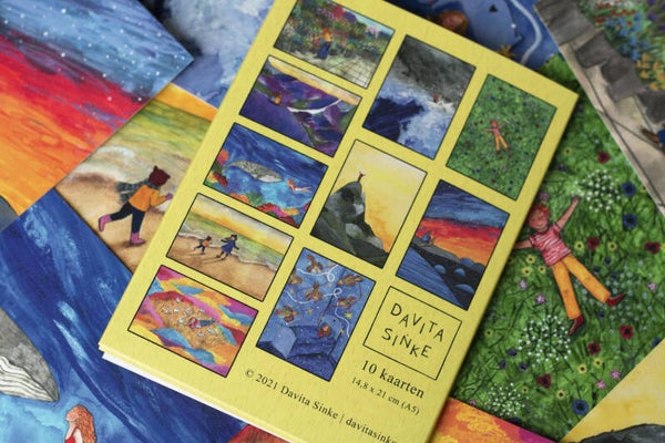 Een set van 10 grote kaarten (A5-formaat) vol droom-achtige, sprookjes-achtige en fijne gewoon-achtige plaatjes. Verpakt in een mapje.